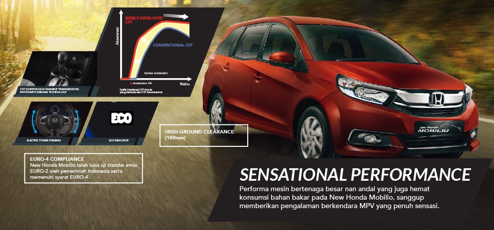 Desain semakin modern, kabin luas, didukung performa prima dan konsumsi bahan bakar yang hemat, serta dilengkapi fitur keselamatan lengkap, New Honda Mobilio memberikan Anda dan keluarga sebuah pengalaman berkendara yang sensational.